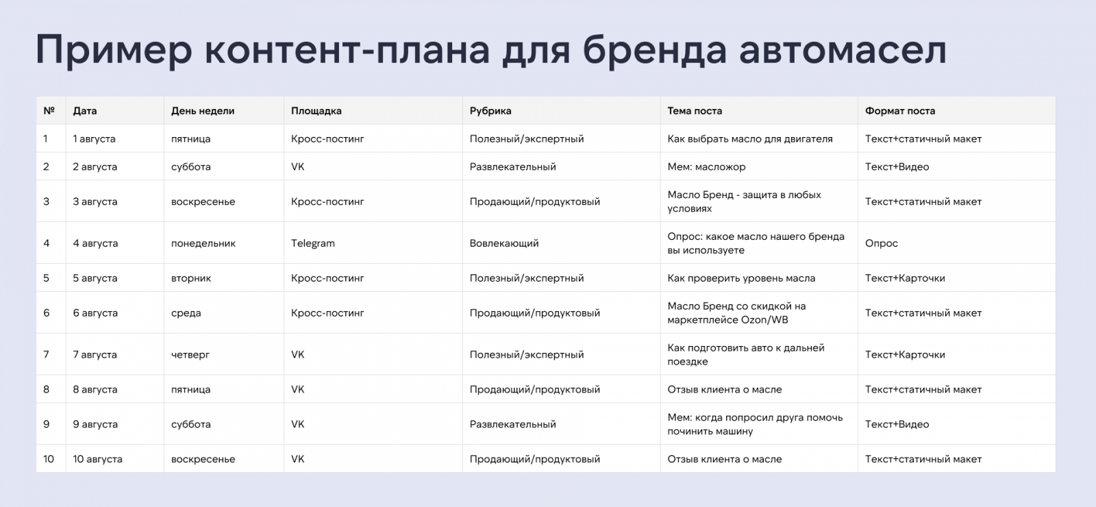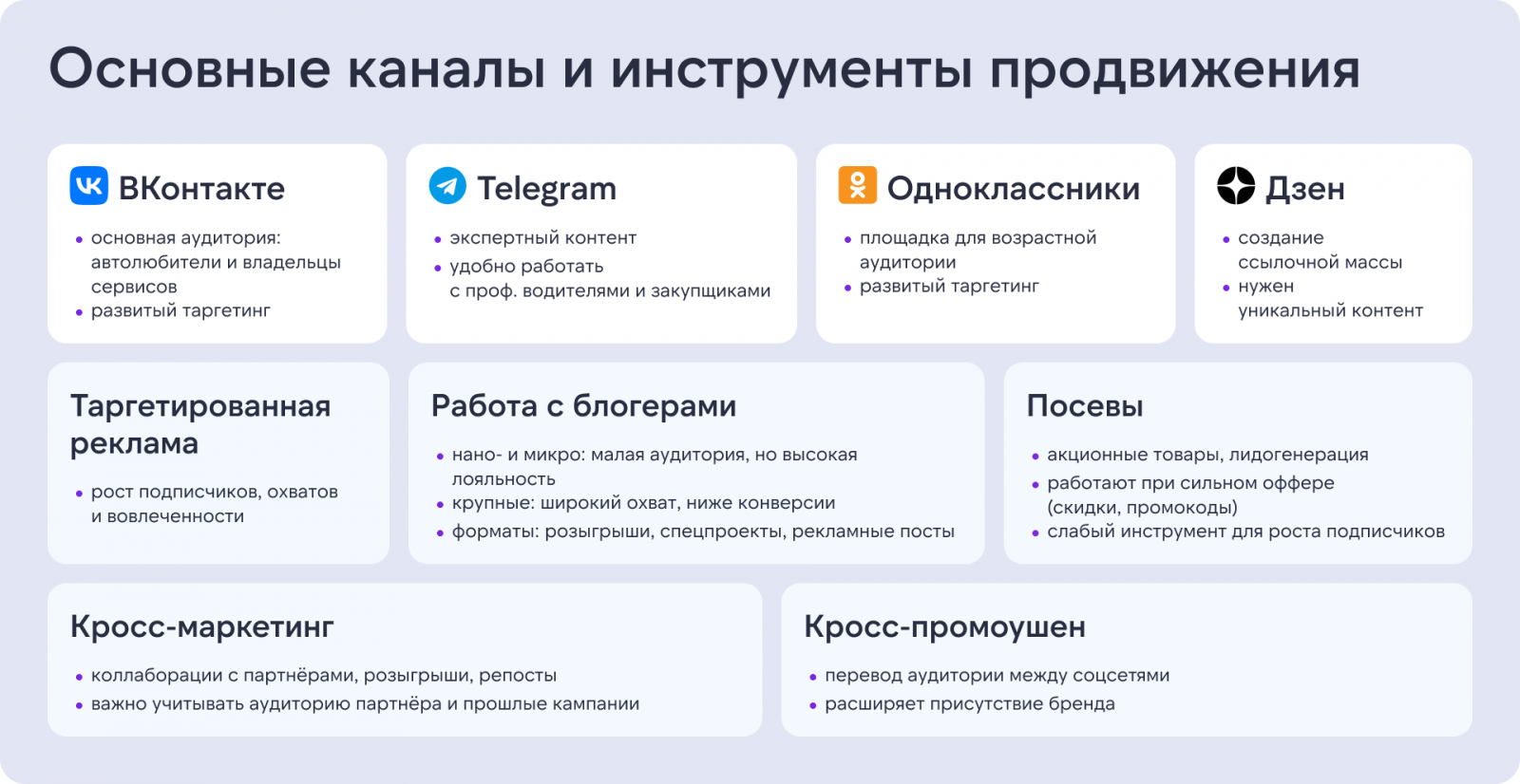 Органический рост и активность аудитории приходят не сразу, поэтому в начале стоит поддержать продвижение разными каналами. Выбор инструментов зависит от бизнес-целей и сезонности продукта, так как для ниши автохимии и масел это актуально.