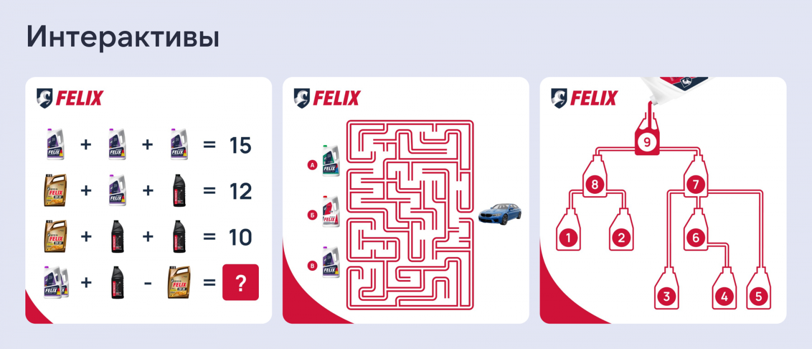 Соцсети для аудитории — место отдыха. Поэтому бренды активнее используют мемы, интерактивы и игровые механики. Такие форматы создают эмоциональную связь и стимулируют активность. Бренд автомасел FELIX регулярно проводит интерактивы.
