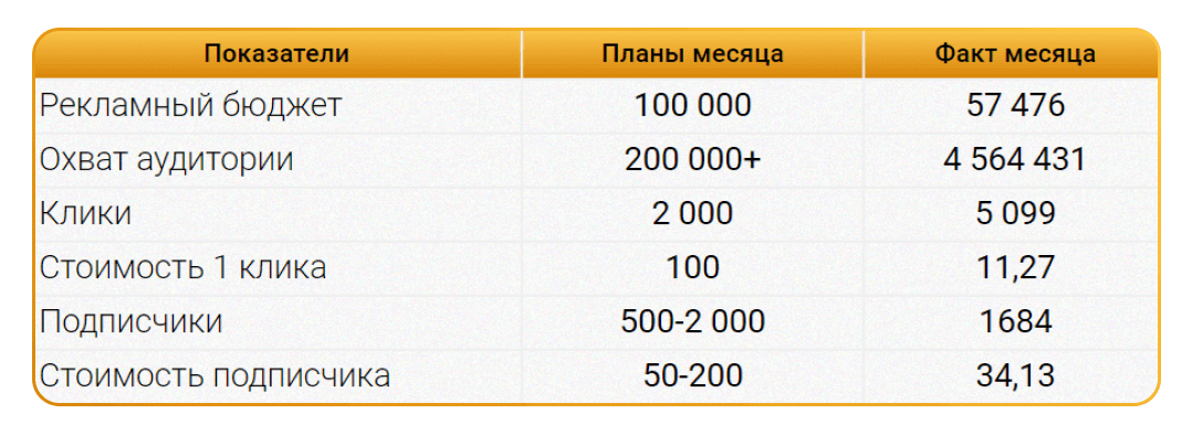 За первый месяц работы с телеграм-каналом мы освоили чуть больше половины запланированного бюджета и получили более 5 000 кликов по цене 11,27 рублей, а также привели 1684 подписчика по цене 34,13 рублей.