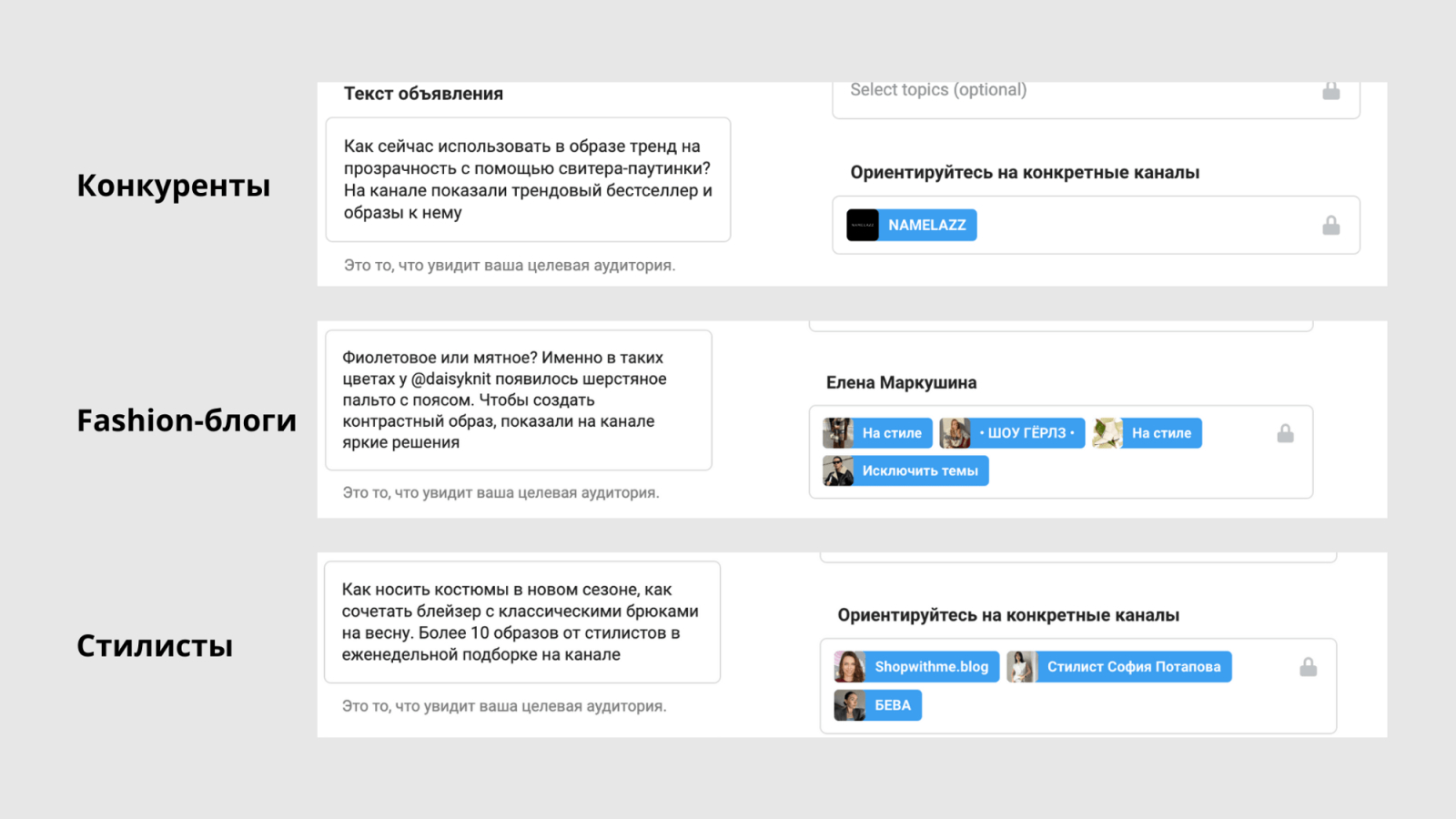во-первых, так проще в дальнейшем сортировать какое направление протестировали, а какое еще нет, во-вторых, так удобнее составлять рекламный текст под запросы аудитории канала по той или иной категории (плюс-минус аудитория там сидит с одинаковыми запросами и потребностями).Текст пишите под конкретные каналы или категорию: не стоит использовать один и тот же текст для показа в каналах с разными тематиками: высока вероятность не попасть в “боль” и слить бюджет.
