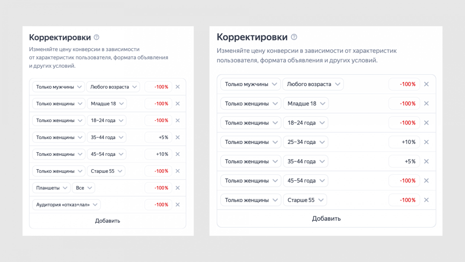 Пример корректировок выше не распространялся на все кампании: было разное соотношение в корректировках по возрасту в зависимости от стоимости продажи в каждой из кампаний. Это вы можете посмотреть в мастере отчетов в кабинете Яндекс.Директ.