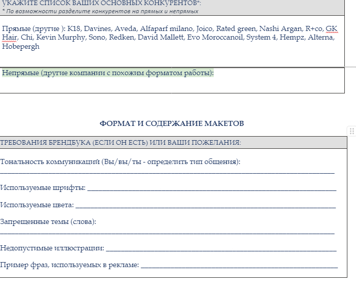 как видим, клиент заполнил бриф частично, нужно дебрифовать.