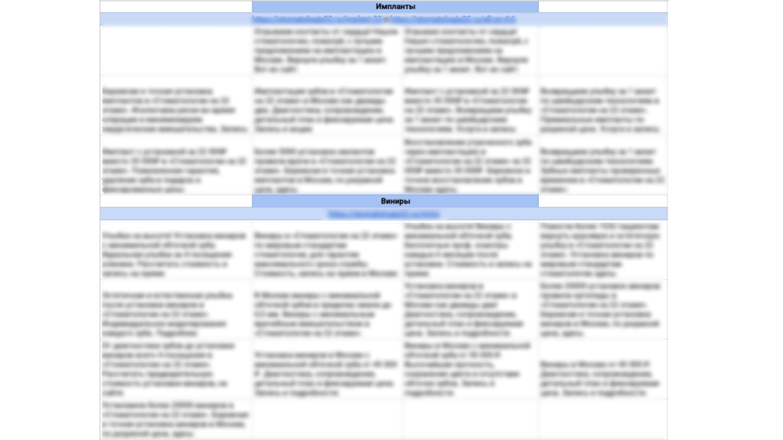Приступили к этапу написания текстов. Изучили портрет ЦА, потребности клиентов, и что предлагает сама клиника, офферы и УТП стоматологии. Итоговые тексты разделили на несколько направлений клиники: имплантация зубов, удаление, установка виниров и общий текст о клинике.