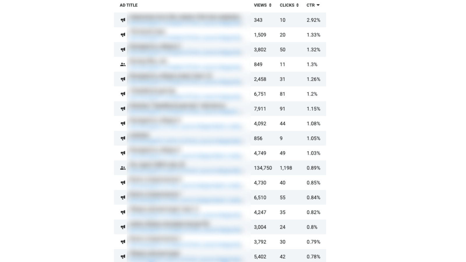 Ранее в Telegram Ads не была доступна данная метрика,а считать ее самостоятельно для такого количества объявлений представляло собой отдельный вид пыток. К нашему счастью, именно на моменте работы с проектом, данную метрику добавили в кабинет Telegram Ads. Результаты отметили как не особо удачные. CTR составлял в среднем до 0,20%. Сразу отметим то, что в Tg Ads CTR значительно ниже, если сравнивать с Директом, и нормы там другие, более низкие.