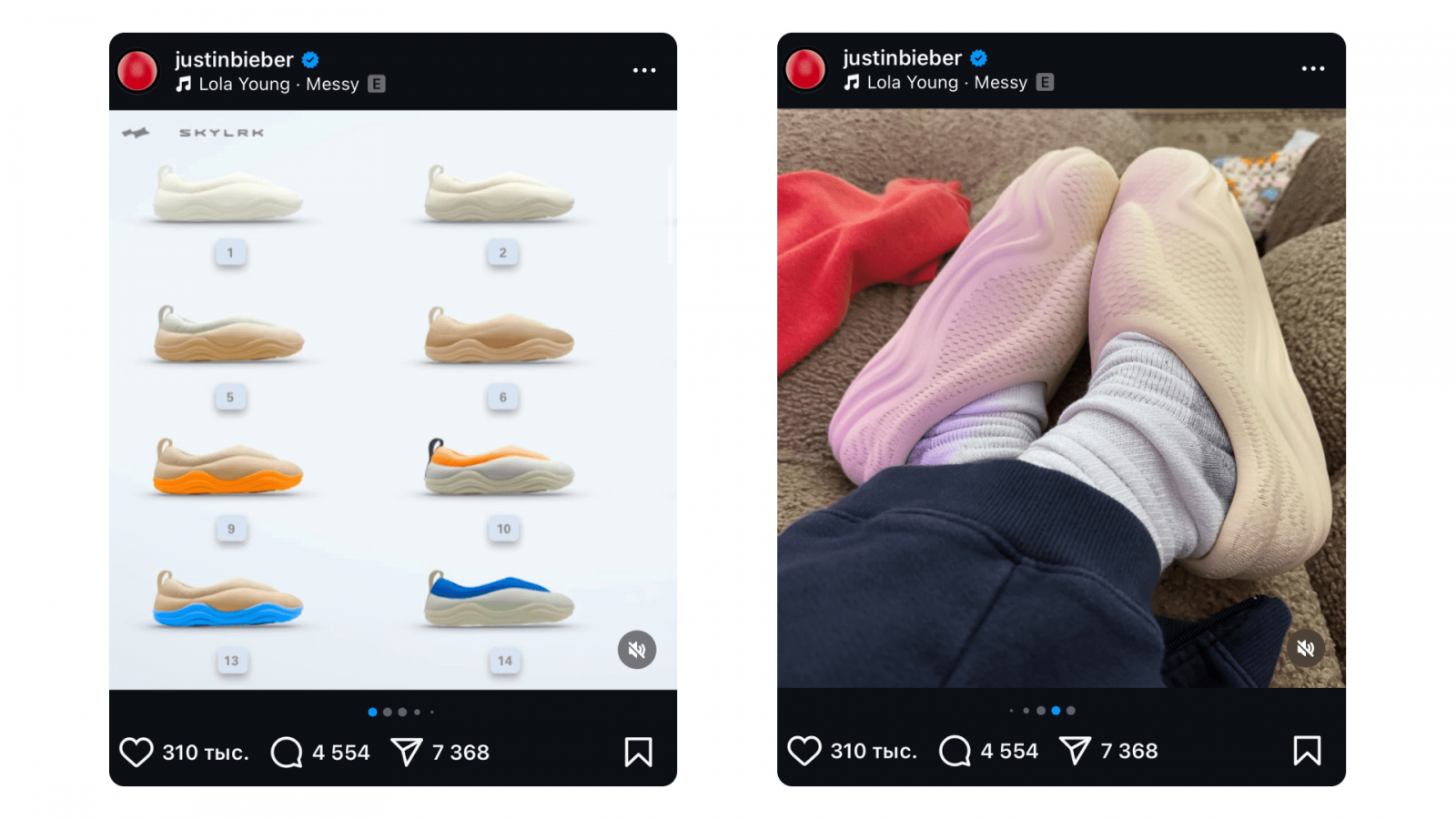 Что происходит через 48 часов? В инфополе появляются десятки материалов, видео и мемов. В это же время — «совпадение». Бибер запускает бренд одежды, обуви и аксессуаров SKYLRK. Анонсированный им силуэт кроссовок уже называют «новыми Yeezy», а соц. сети бренда — в топе обсуждений.