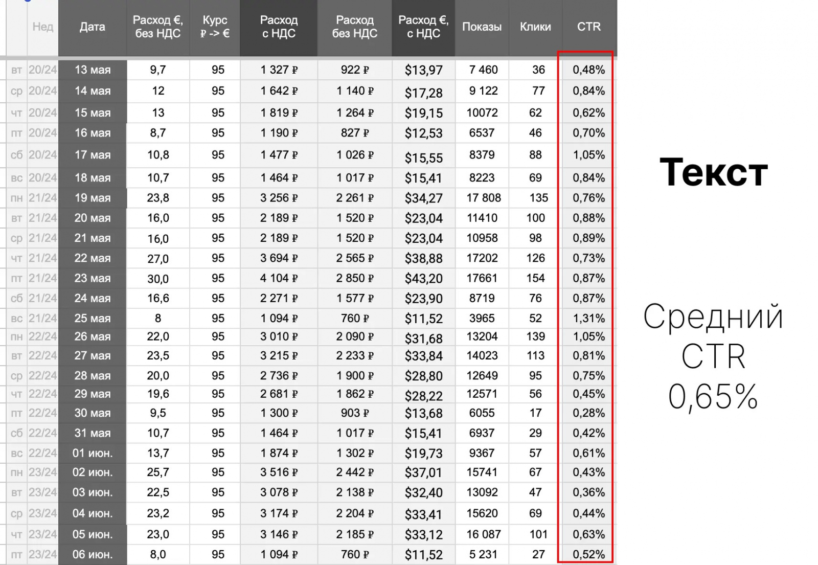 Для многих людей Tg Ads — непонятный инструмент, с непонятными результатами, который хотелось бы попробовать, но пороги входа кусались даже до появления картинок. Согласитесь, не каждый готов выложить 1500€ + 20% комиссии и 20% НДС только для того чтобы попробовать. То же самое и с новым форматом — мы вздыхали и продолжали работать со старым добрым текстовым форматом в большинстве проектов.