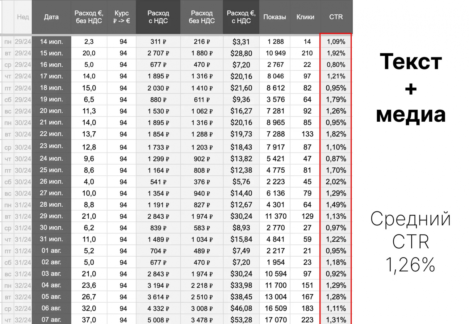 На старте и правда всё выглядело как реклама мечты. Стоило только добавить картинку или короткое видео, как количество переходов стремительно росло. В первый же день CTR вырос на 10% по сравнению с текстом, конверсия в подписку подтянулась на 12%.