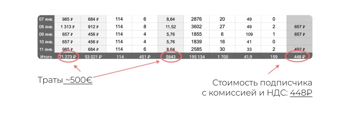 Параллельно мы осознаем важную вещь про бюджет. С бюджетом €500 в тестах подписчик выходит дороже — 300–400 рублей (зависит от ниши).