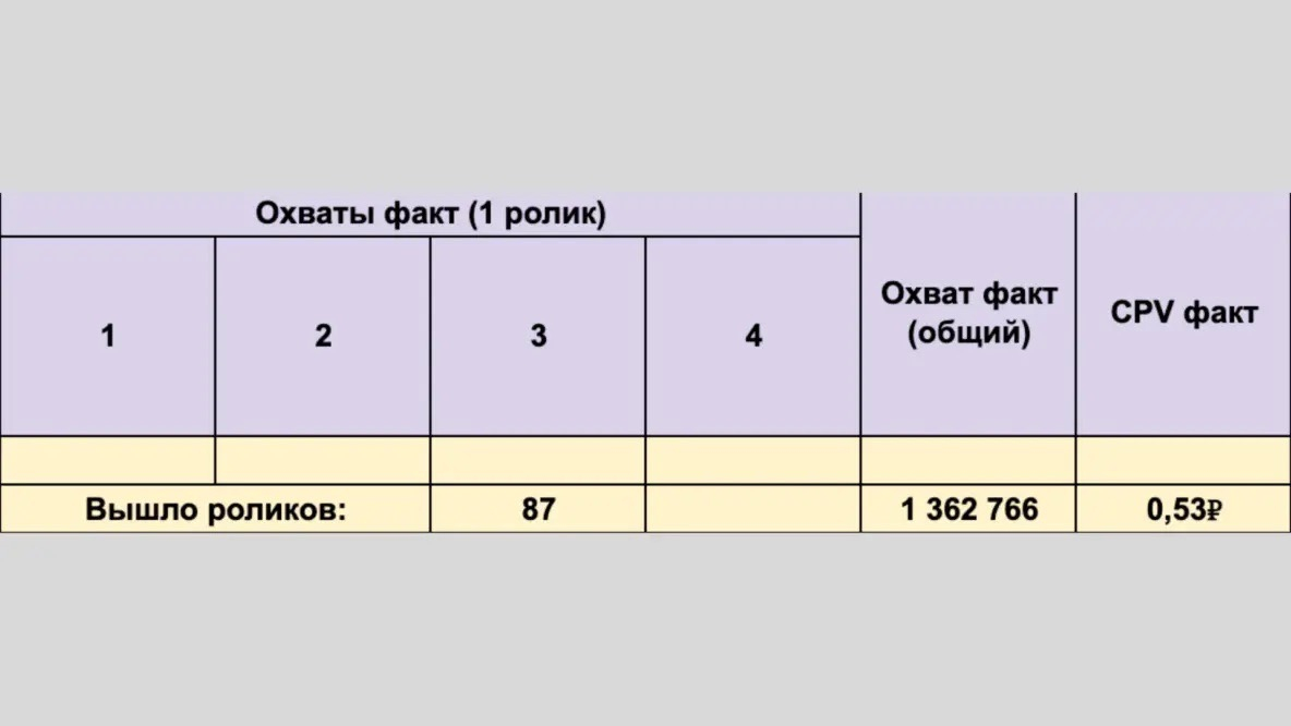 Да, такие небольшие цифры далеки от итоговой цели, но стоит учесть, что в рамках публикуемого контента они не окажут резко негативного влияния на эффективность всех размещений. Не спешите отключать инструмент из-за нескольких не очень успешных роликов: важно понимать, что бывает у автора 1-2 видео могут набрать небольшое количество охвата, а третье видео закроет все планируемые просмотры.