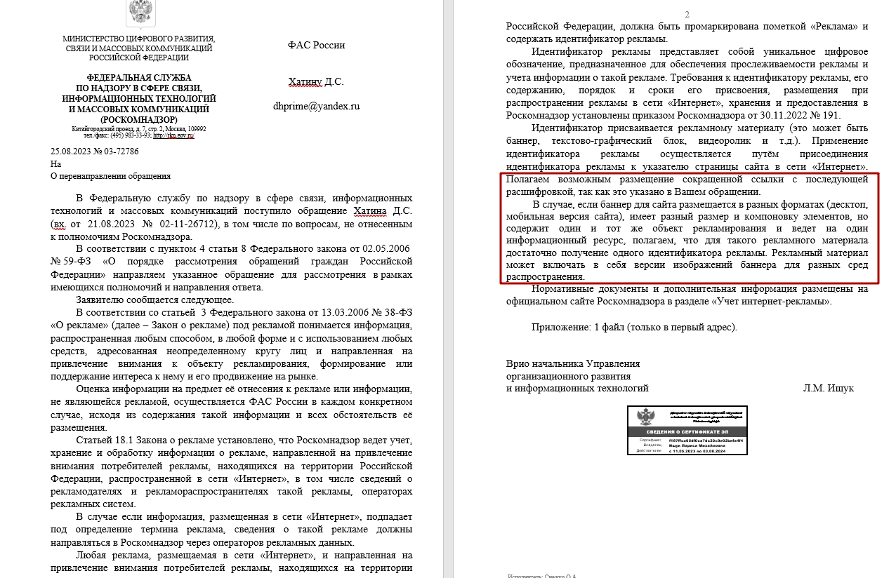 Поступил официальный ответ от Роскомнадзора на тему маркировки рекламы по моему запросу насчет возможности использования сократителей ссылок для рекламных объевлений, а также возможности получать один токен в ОРД под множество ресайзов исходного креатива