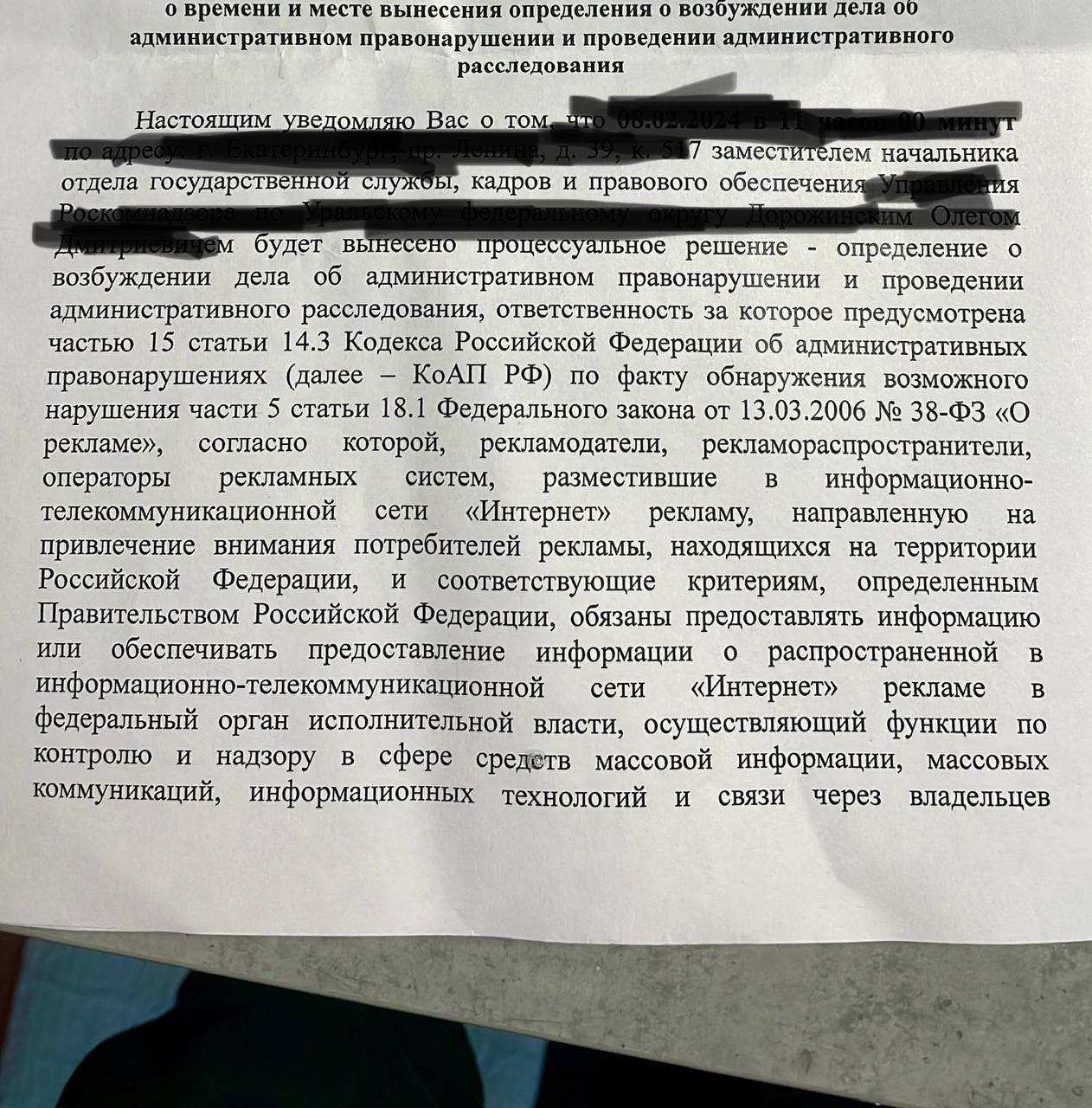 Поступила информация, что представителям бизнеса (юрлицо) требуется явиться в офис Роскомнадзора по Уральскому федеральному округу, где будет вынесено определение о возбуждении дела об административном правонарушении, ответственность по которому предусмотрена частью 15 КОАП 14.3 по факту обнаружения возможного нарушения части 5 статьи 18.1 закона о рекламе 38-ФЗ
