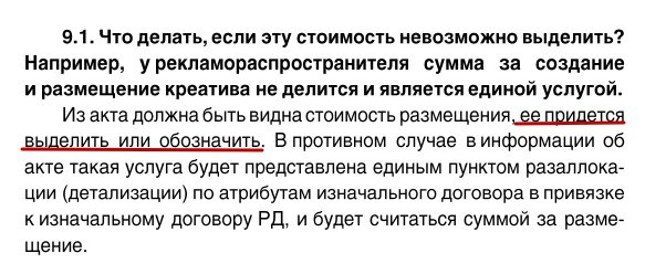 В итоге, без выделения суммы на рекламу в первичных документах либо в закрывающих документах, вы всегда будете переплачивать ОРД порой в несколько раз, если сумма на рекламу в договоре пропорционально не высокая, а все работы приходятся на другие виды услуг (seo, контент, продакшн и прочее).