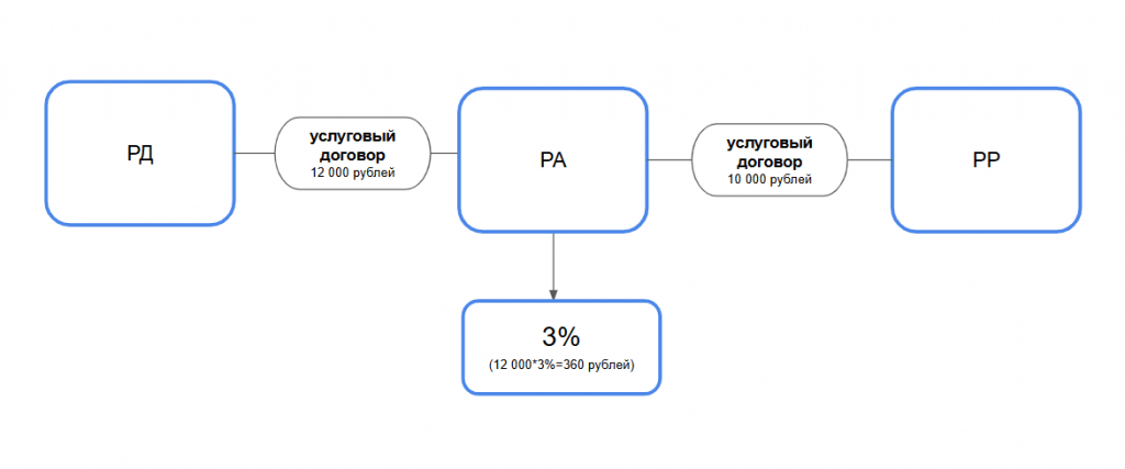 На картинке пример, когда Рекламодатель оплатил РА (рекламное агентство), согласно медиаплану, 12 000 рублей для организации размещения рекламы в интернете. Агентство из полученной суммы оставит себе 2 000 рублей в качестве вознаграждения по агентскому договору, а 10 000 отправит направо по цепочке своим подрядчикам.