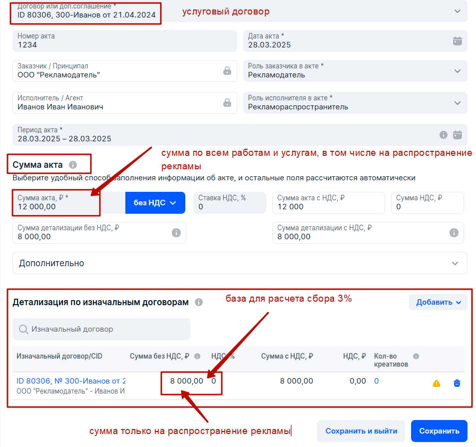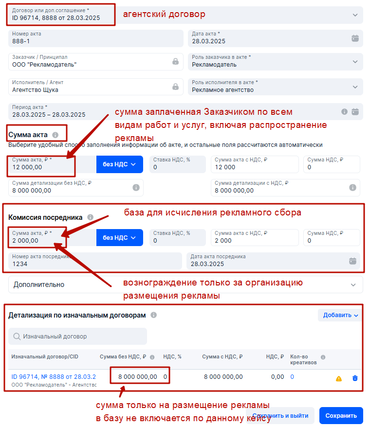 Естественно, если контракт РД-РА включает много видов работ, кроме размещения рекламы в интернете с указанием общего (суммарное) вознаграждения, то в акте ОРД требуется принудительно выделить и указать в поле Вонаграждение агента именно ту сумму, которая приходится ТОЛЬКО на организацию размещения рекламы. Это важно, иначе Агентство переплатит по рекламному сбору.