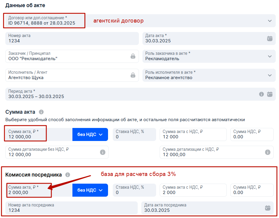На примере ОРД Озон для цепочки РД-РА (агентский договор). В данном кейсе РА получает 12 000 рублей за организацию размещения рекламы от Рекламодателя по Агентскому договору РД-РА, где официально выделено поле вознаграждения Агента в размере 2 000 рублей