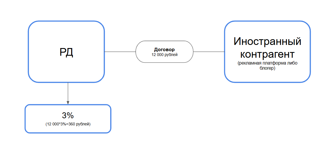 *Теxнически пока не понятно, так как реальная оплата будет производиться, скорей всего, в иностранной валюте, но в ОРД, естественно, будет зафиксирована рублевая сумму по курсу ЦБ. В итоге Рекламодатель, как налоговый агент, заплатит 12 000 * 3%=360 рублей в качестве рекламного сбора со своего счета