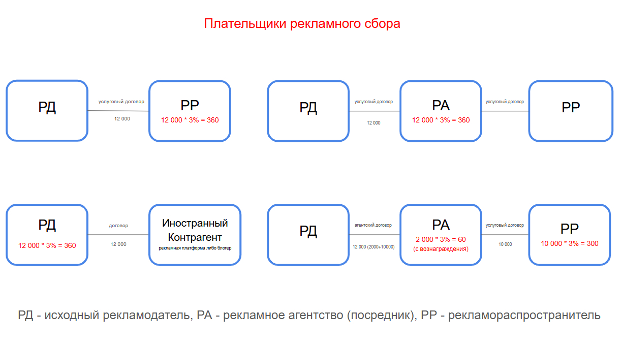 При этом другие участники цепочки справа от РА не будут платить ничего, так как агентство выполнит все обязательства по уплате небходимой суммы рекламного сбора вместо них, согласно п.5 НПА Роскомнадзора
