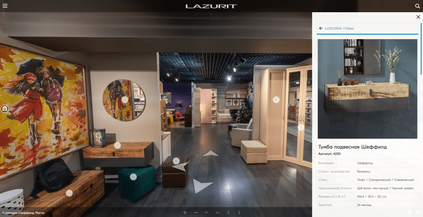 Виртуальное путешествие по флагманскому салону Lazurit Мебель в Москве с возможностью получения информации при помощи карточек товара (Product Cards) стало доступно для посетителей сайта в феврале 2023 года. У пользователей есть возможность «прогуляться» по всему салону или активировать фильтр по категориям, если интересует мебель в конкретную комнату: спальню, гостиную, детскую или прихожую. При наведении курсора на конкретный модуль программа показывает характеристики мебели: размер, цвет, материал, стиль и т. д.