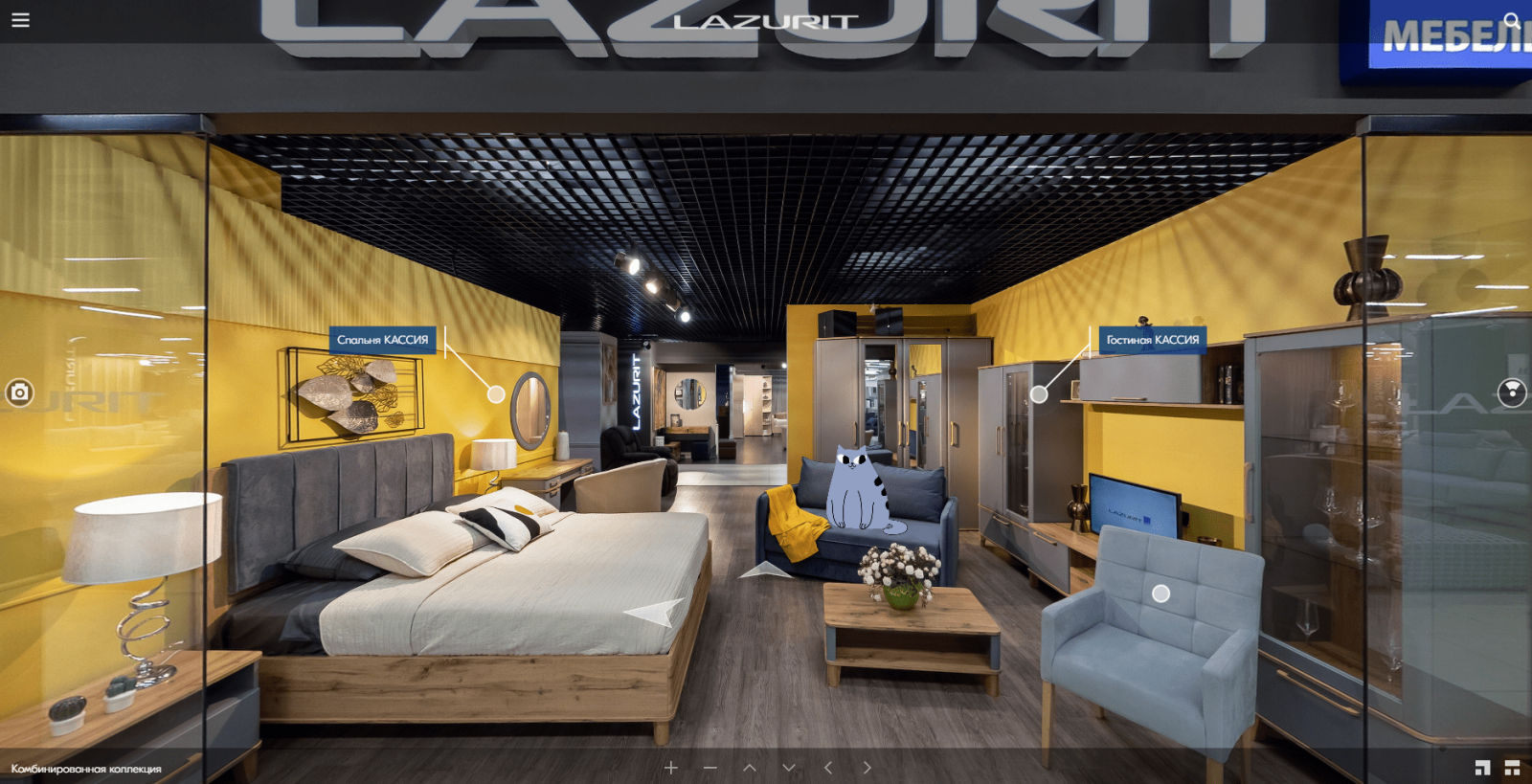 Бренд Lazurit Мебель при разработке 3D-тура учел не только практическую, но и эмоциональную составляющую. «Гуляя» по салону, пользователи встречают симпатичного маскота — анимированного кота Пуфика, который с комфортом разместился на разных предметах мебели. Пуфик уже давно сопровождает все маркетинговые активности бренда, появляясь на баннерах, в видеороликах, соцсетях и спецпроектах Lazurit.