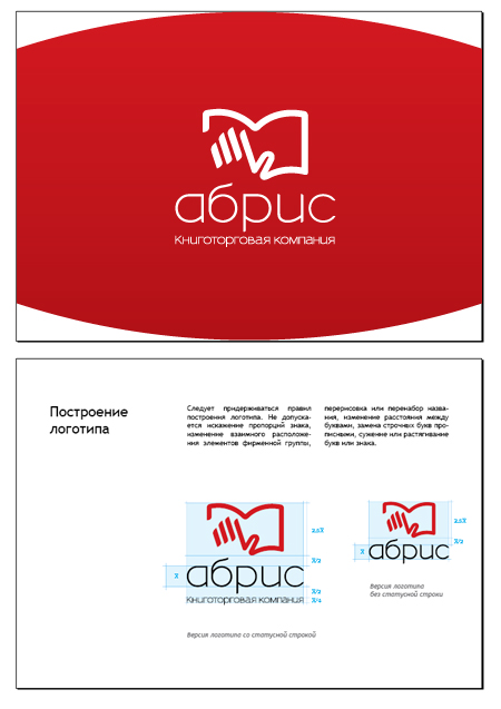 Концепция построена на раскрытии деятельности компании (книготорговля, научно-популярная литература, оптовые продажи). Был разработан простой понятный знак, выполненный в контуре, будто нарисованный в одно прикосновение (как основная ассоциация с понятием «абрис»). Сам символ — ладонь, держащая книгу символизирует читающего человека, изучающего, узнающего что-то новое.