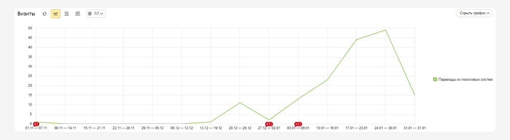 А процент брендовых запросов не превышает 13% от всех поисковых. То есть сам бренд SKOGGY растет весьма медленно по сравнению с входящим трафиком на сайт.