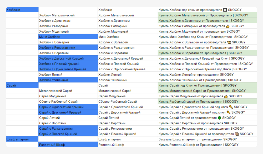 Таким образом мы получили структуру, когда у нас есть основные категории: гаражи, хозблоки и блок контейнеры, а все входящие в них запросы распределены между основными подкатегориями и страницы с тегами.