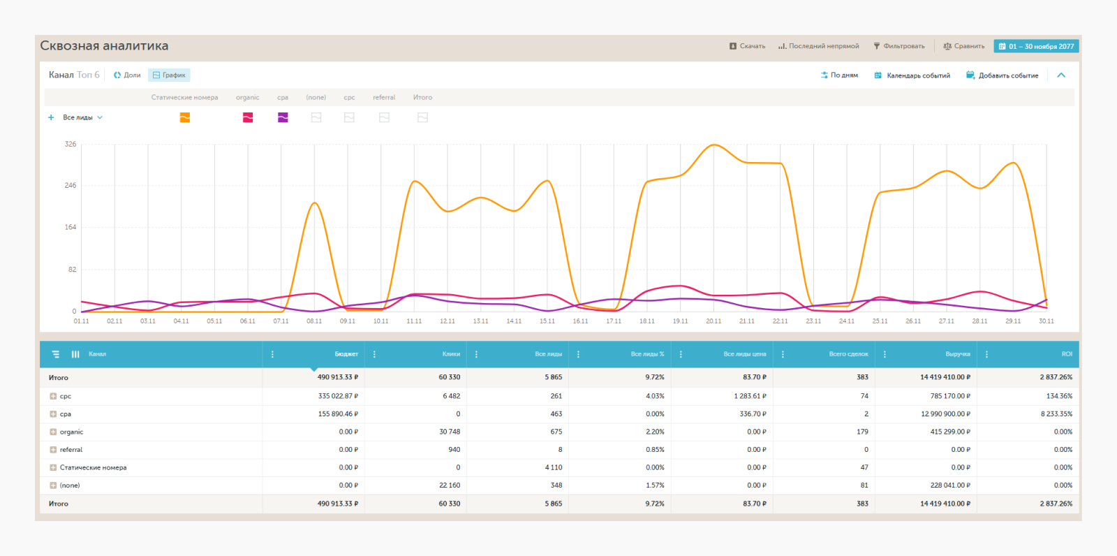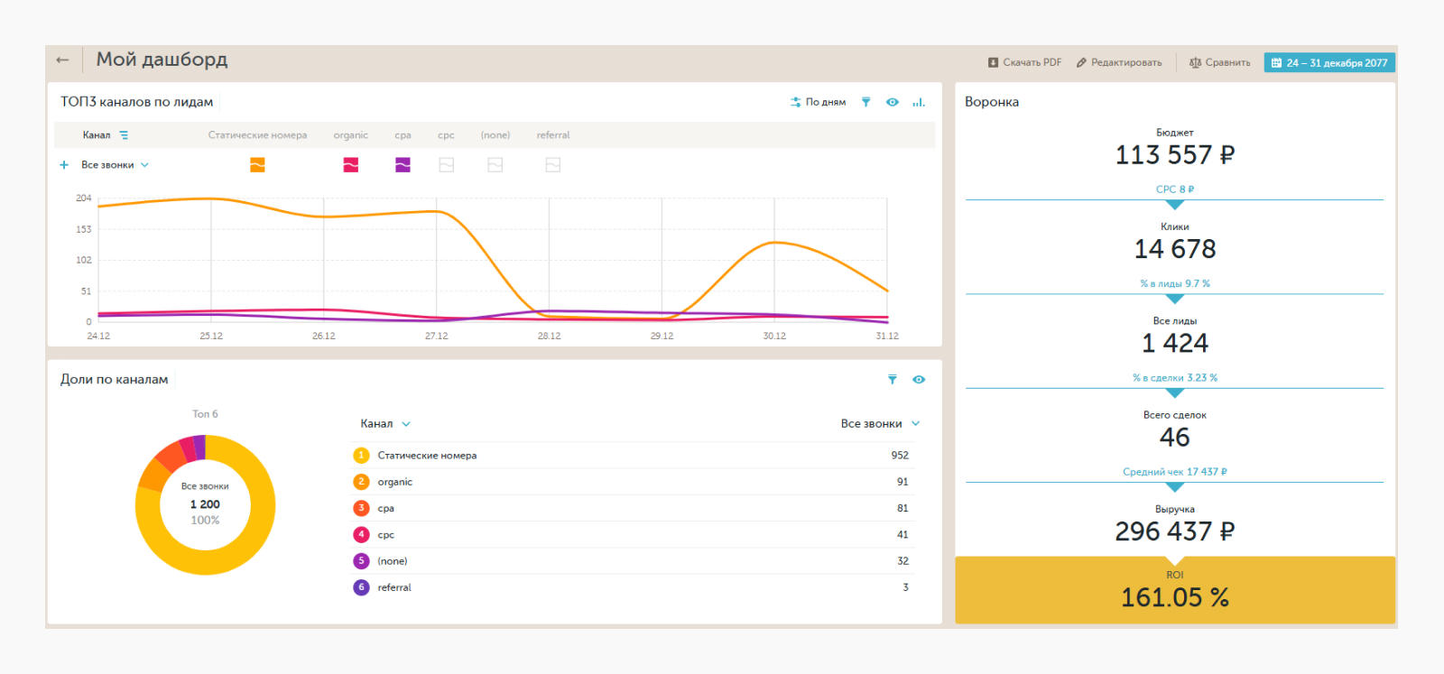 Сквозная аналитика позволяет соединить все данные: рекламу, звонки, заявки, продажи, сумму сделок и показать, какие каналы реально окупаются. Это не просто красивая отчетность, а инструмент, который показывает, куда выгоднее вкладывать бюджет и что лучше отключить.