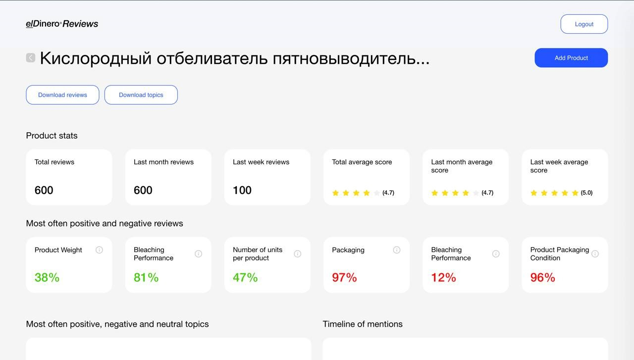 Процесс анализа отзывов с карточки товара или целой категории занимает не больше 20 минут, а общая пропускная способность сервиса — 1 миллиард отзывов в сутки. Ключевой особенностью elDinero Reviews является выявления тональности отзывов, отображение Most Often (самых частых) положительных и отрицательных отзывов, а также группировка отзывов в темы по наиболее упоминаемым параметрам. Также сервис обучен анализировать только реальные оценки покупателей, выделяя из набора данных поддельные и одинаковые отзывы. Для анализа elDinero Reviews использует генеративные и GPT модели, которые обучены на качественной разметке отзывов.