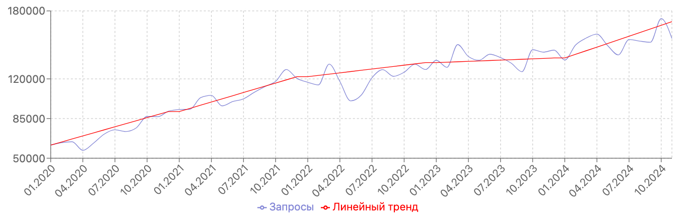 Угловые коэффициенты (рост запросов в день): 2020: +89,7 запросов в день 2021: +93,2 запросов в день 2022: +37,6 запросов в день 2023: +12,4 запросов в день 2024: +106,8 запросов в день