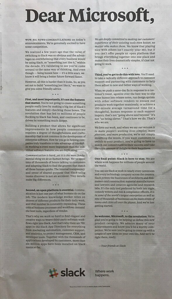 Slack встретил это вызывающе — опубликовал открытое письмо-приветствие конкуренту на всю полосу The New York Times. Мол, добро пожаловать на рынок, но мы здесь уже давно и знаем, что делаем, сейчас даже дадим парочку советов.