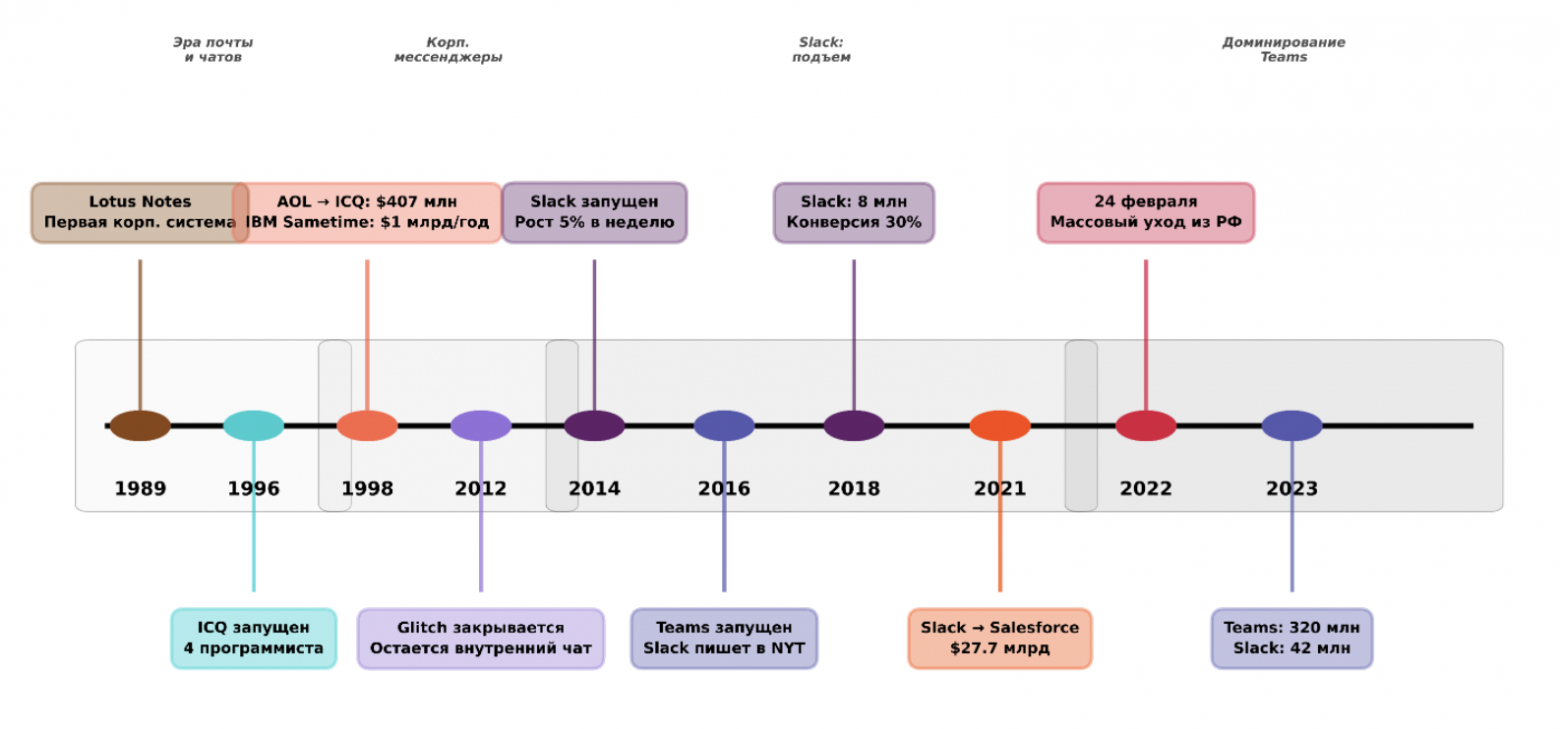 В 2000-х были еще попытки заработать на корпоративных чатах. Yammer (2008) позиционировался как "корпоративный Facebook" — Microsoft купил его в 2012 за $1,2 млрд. HipChat (2010) делал чат для разработчиков, но закрылся в 2018, не выдержав конкуренции. Реально выстрелил другой продукт.