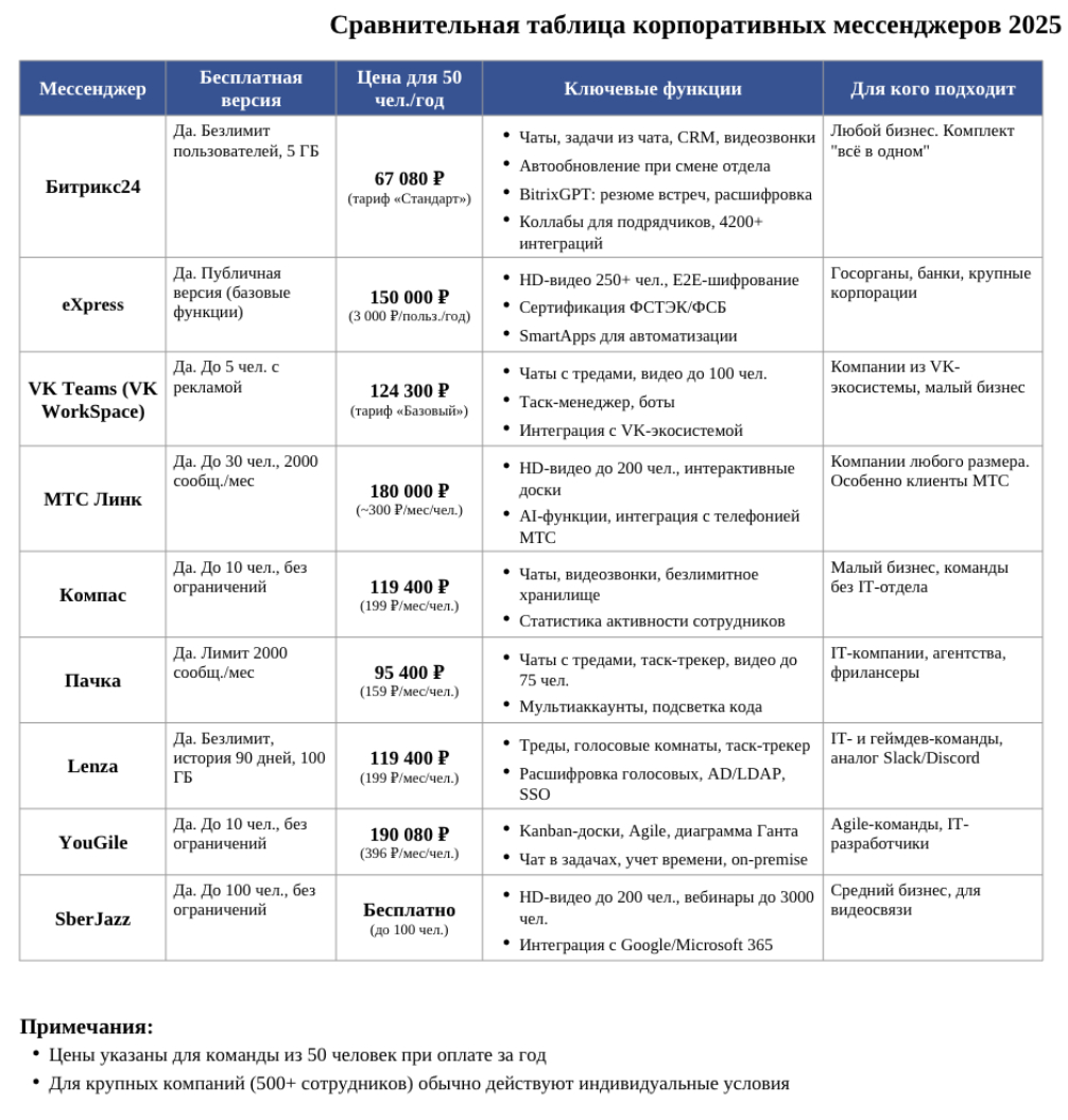 Размер компании — если компания меньше 10 человек, подойдет бесплатная версия любого продукта или простой чат вроде Компаса. Компаниям на 50-100 человек нужны платные планы с расширенными функциями. Корпорациям на тысячи сотрудников требуются энтерпрайз-версии.
