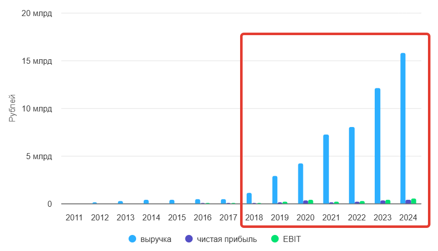 А если сравнить с 2018 годом, когда выручка была 1,1 млрд ₽, то компания за 6 лет выросла в 14 раз.