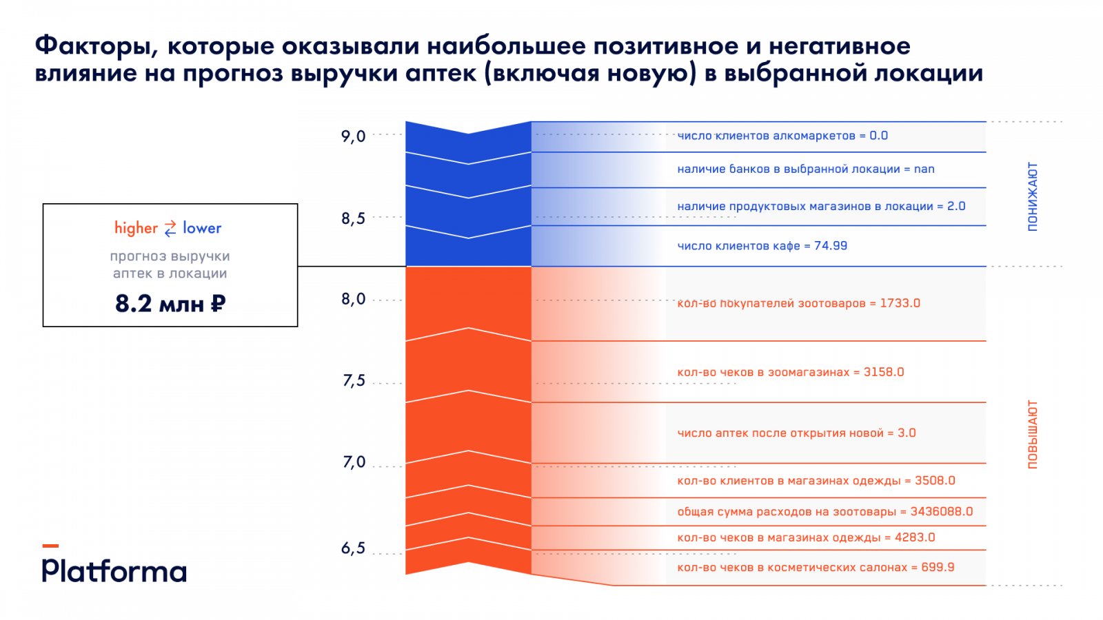 Мы провели глубокий анализ геоданных локаций с более 60 000 работающих аптек. И в 5,1% случаев важнейшим фактором прибыльности аптек стали клиенты кафе и ресторанов в конкретном квадрате. Оказалось, что средний чек посетителей заведений общепита прямо влияет на прибыльность аптек.