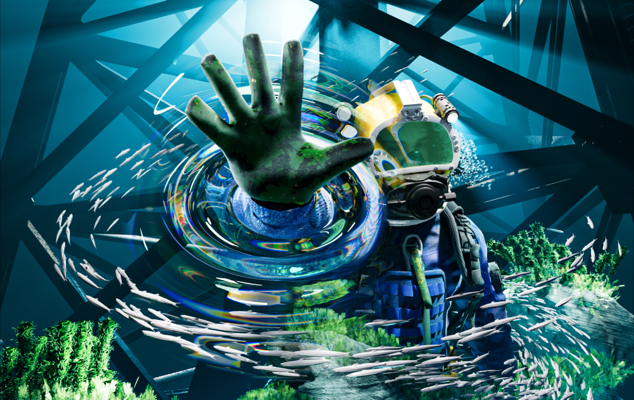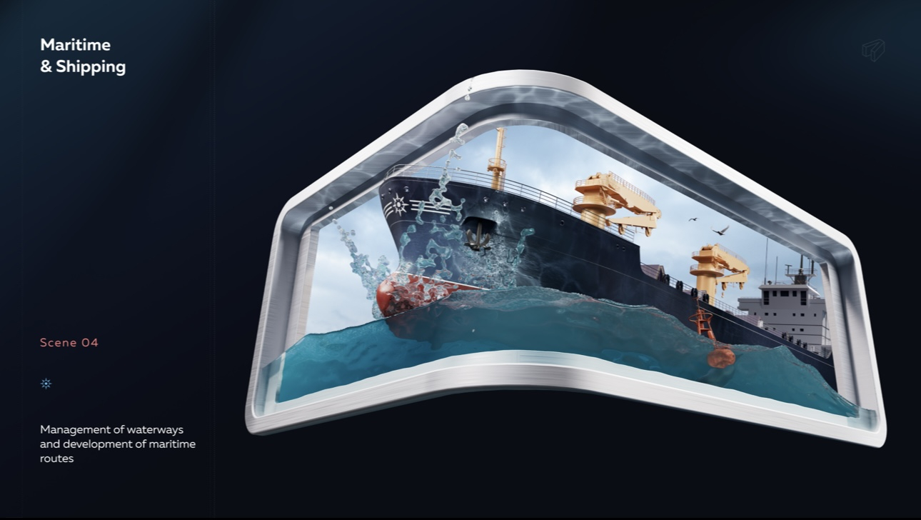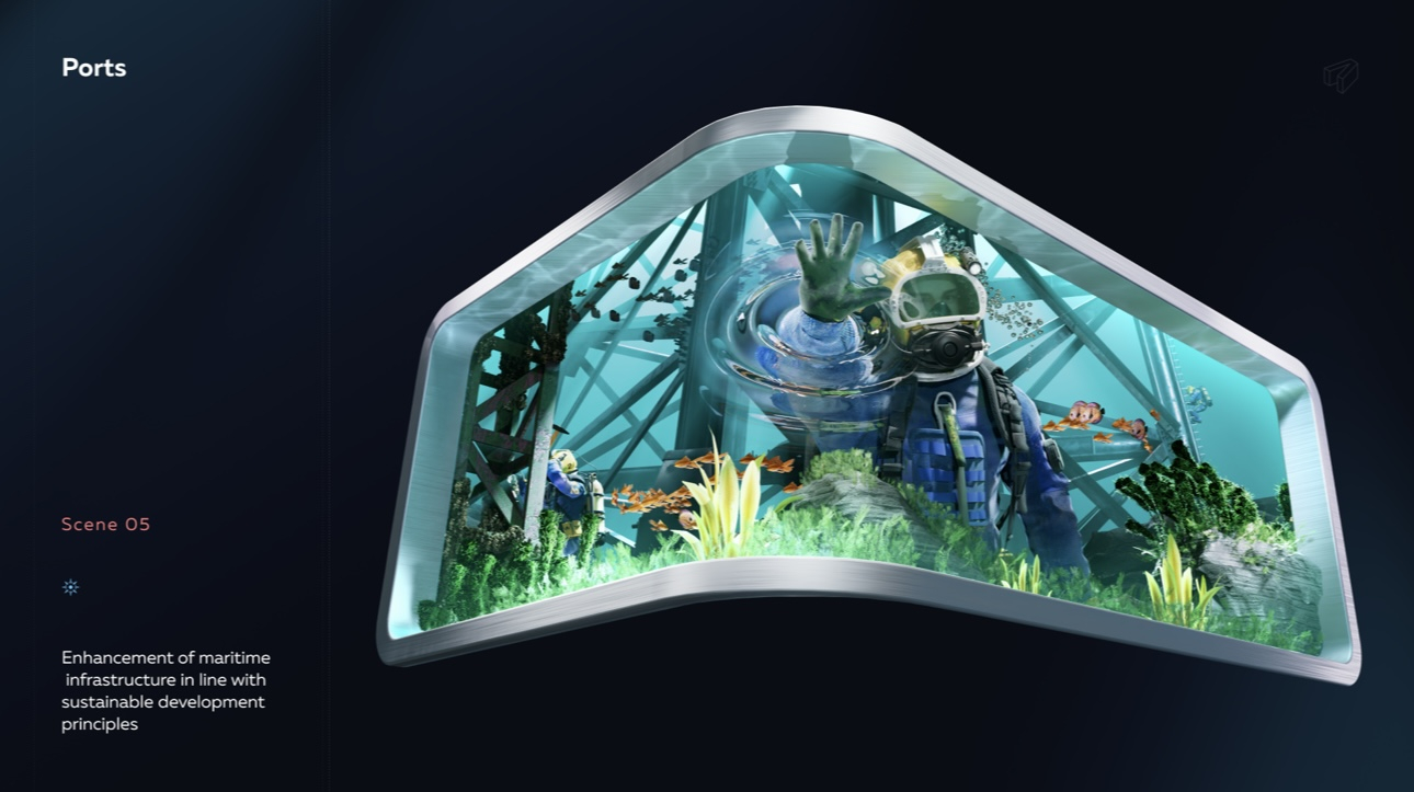 Технически ролик был разработан с учетом специфики углового экрана и эффекта naked eye – он должен был обеспечить объемное восприятие контента зрителем без использования дополнительных устройств. Naked Eye объекты должны были выходить за рамки экрана в пространство выставки. Для этого в каждой сцене мы выбрали ключевой образ, элементы которого и создавали 3D-эффект. Например, в сцене “Улучшение морской инфраструктуры” один из водолазов пробивал рукой поверхность экрана, чтобы помахать зрителям.