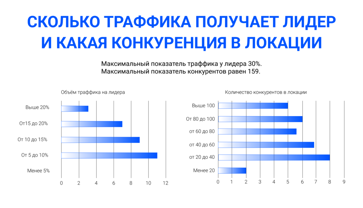Есть зависимость, что чем больше конкурентов, тем ниже может быть доля трафика, приходящегося на лидера, но не было примера, когда этот показатель у лидера опускался ниже 5%.