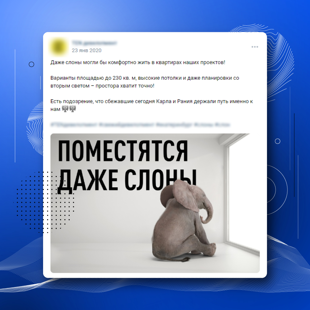 1. Если ваш бренд из регионов, то особенно важно мониторить и реагировать на локальные новости. На скриншоте выше — пример такой отработки, когда из проезжающего зоопарка сбежали слоны. Репостов было в разы больше обычного — новость свежа, мелькает в местных пабликах, поэтому понятна всей аудитории и интересна. За оперативность даже получали похвалу от местных коллег по цеху — быстро, без долгого согласования реагировать на такие вещи тоже важно.