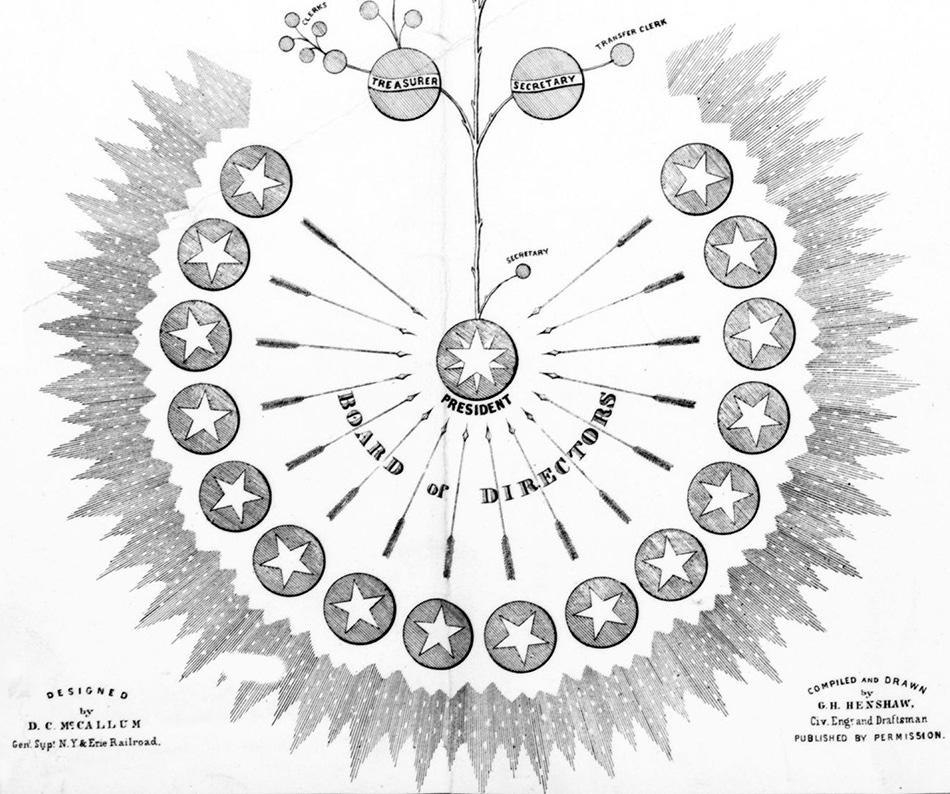 В 1854 году Дэниел Маккаллум, инженер и управленец, занявший пост генерального суперинтенданта (управляющего) железной дороги, соединяющей Нью-Йорк с озером Эри, столкнулся с задачей, которая сегодня кажется типичной: как эффективно управлять сложной системой, где задействованы тысячи сотрудников, десятки станций и протяженные маршруты.