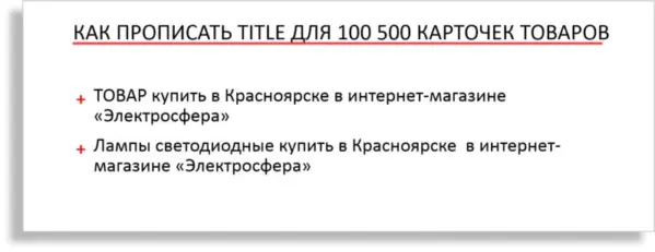 Как прописать Title для миллиона карточек товара. Я вам даю пример шаблона, как это делаем мы. Можете просто подставлять свои данные.