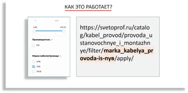 Из фильтра создается отдельная страница. Например, на следующем рисунке представлен фильтр электротехнических товаров категории пув. Если человек ищет категорию данного кабеля, то попадает на эту страницу.