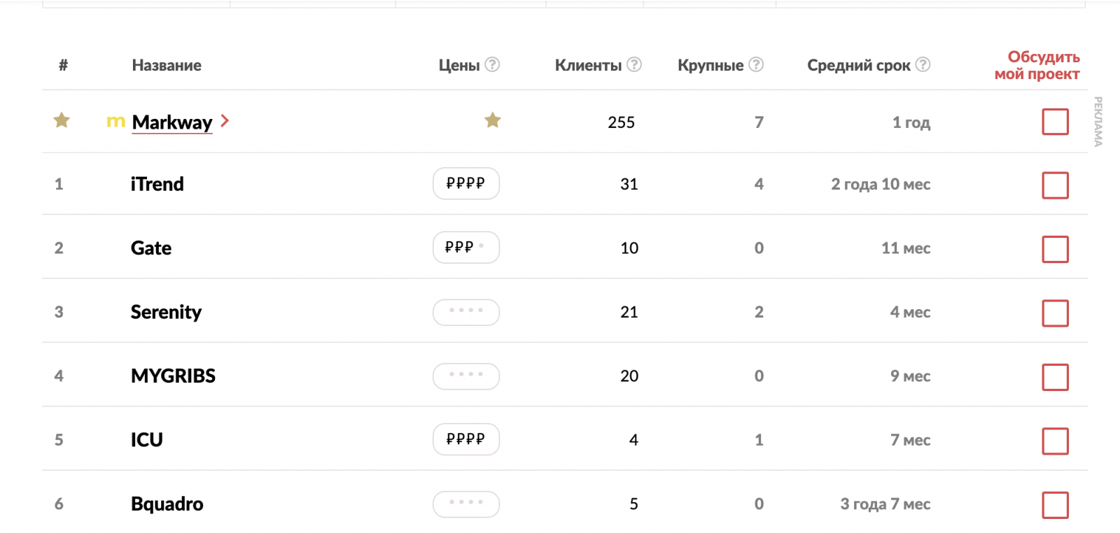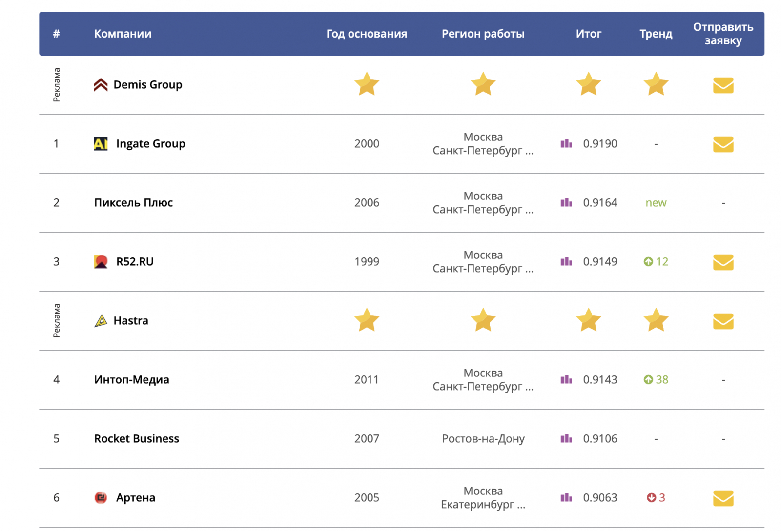 В рейтинге представлены 2062 агентства. Есть отдельные узкопрофильные рейтинги PR-услуг, SMM, мобильной разработки, event-маркетинга и так далее.