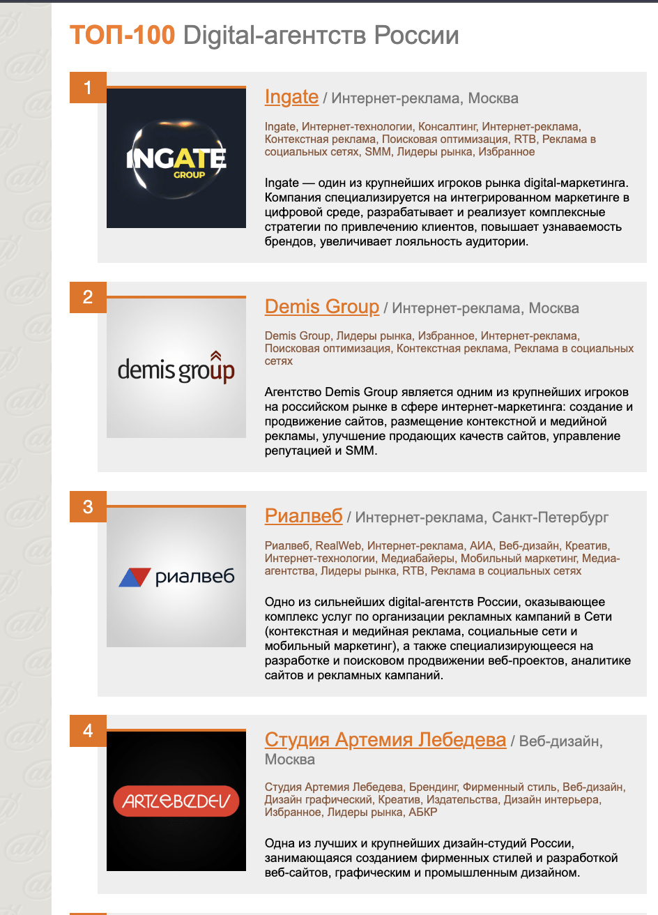 Главный срез digital-компаний России. Формирует топ ведущих веб-студий, агентств контекстной рекламы, SMM-подрядчиков и других digital-компаний.