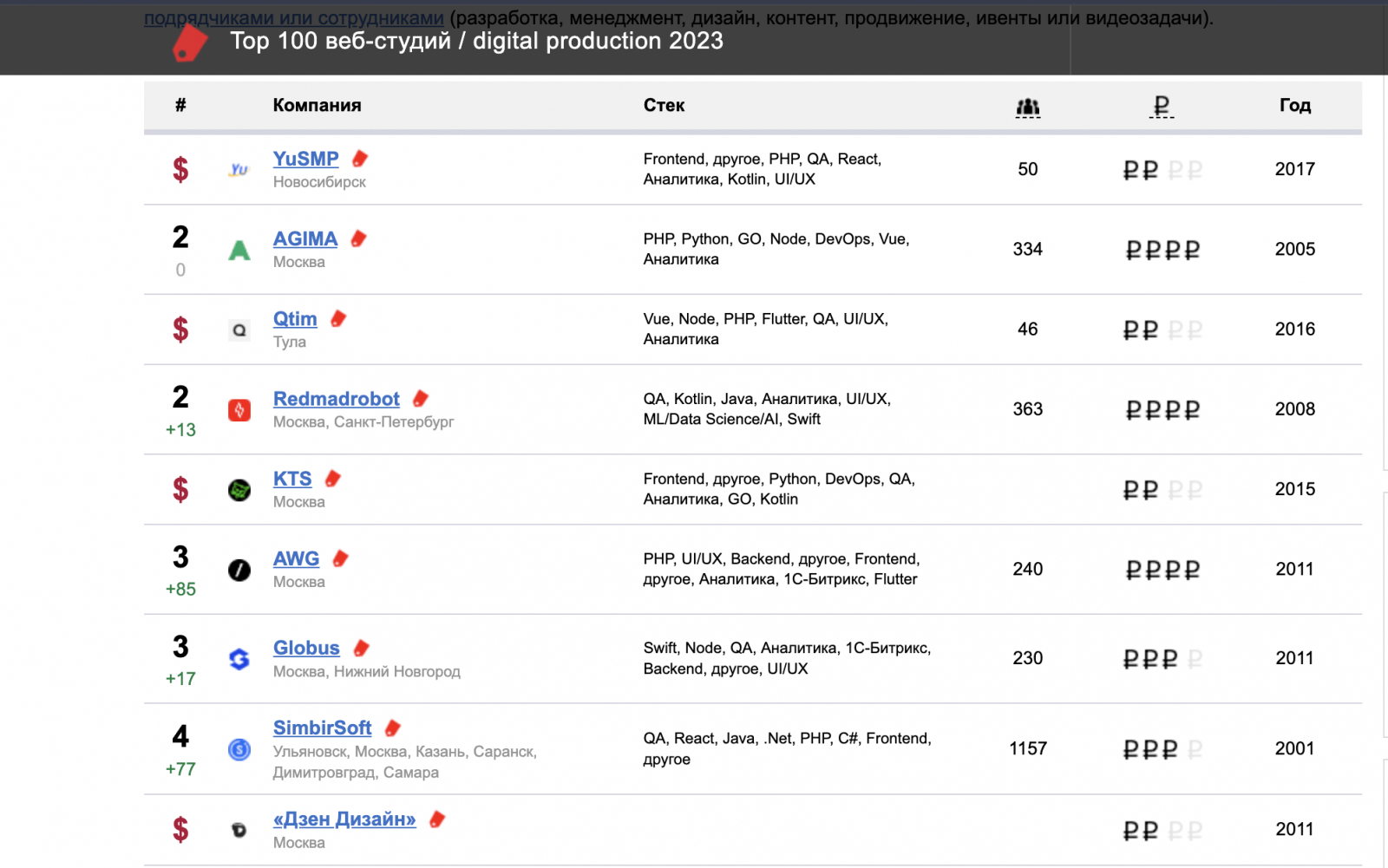 Даты: в 2023-ем выпустили рейтинги студий/продакшнов, веб-, mobile- и аутстаф-разработчиков, дизайн-студий и Telegram-каналов. Есть надежда, что скоро Алексей Раменский объявит о подготовке новых.