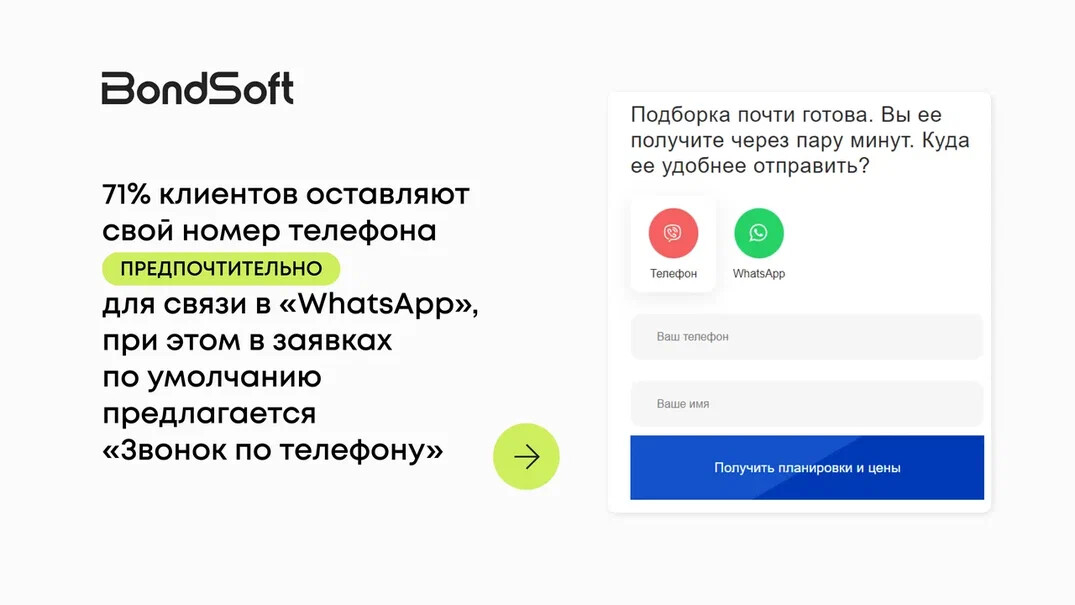 Застройщики предлагают звонки — клиенты выбирают переписку. Это подтверждается статистикой заявок, полученных из интернета: клиенты оставляют свои контакты, при этом целенаправленно меняют желаемый способ связи на WhatsApp при установленной по умолчанию опции "Звонок по телефону".
