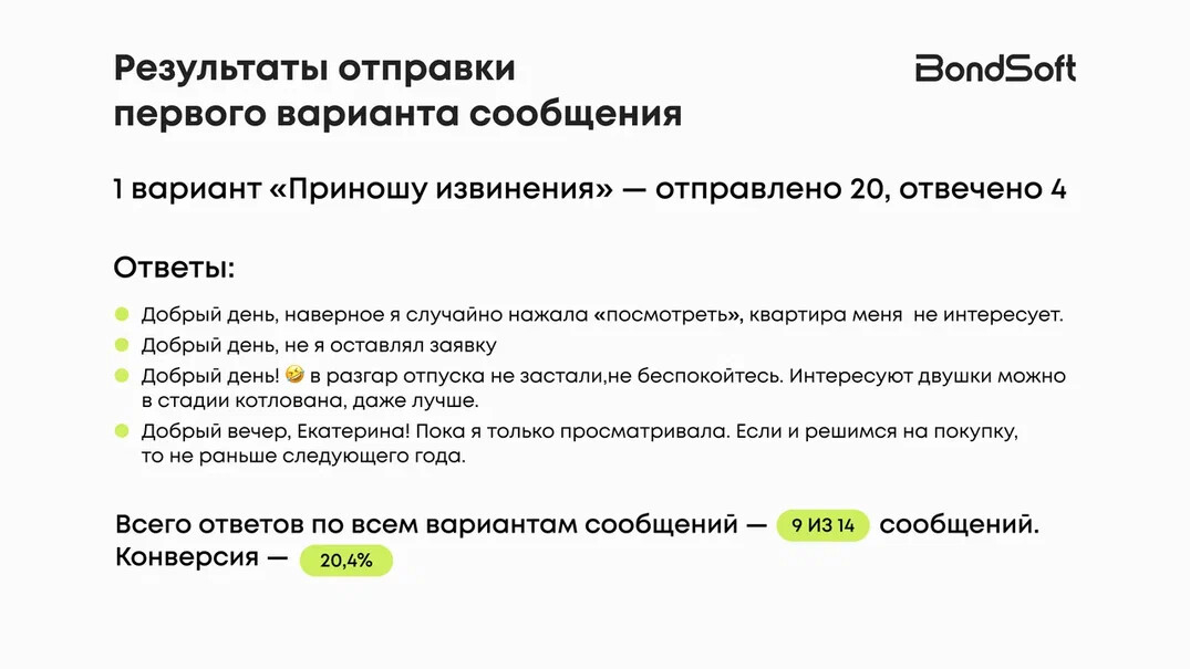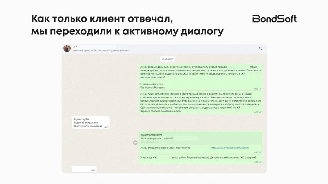 Результаты эксперимента превзошли все ожидания. Клиенты активно отвечали на сообщения, вступали в диалог и демонстрировали интерес. Это подтвердило, что мессенджеры могут быть не просто альтернативой телефонным звонкам, но и более эффективным средством коммуникации.