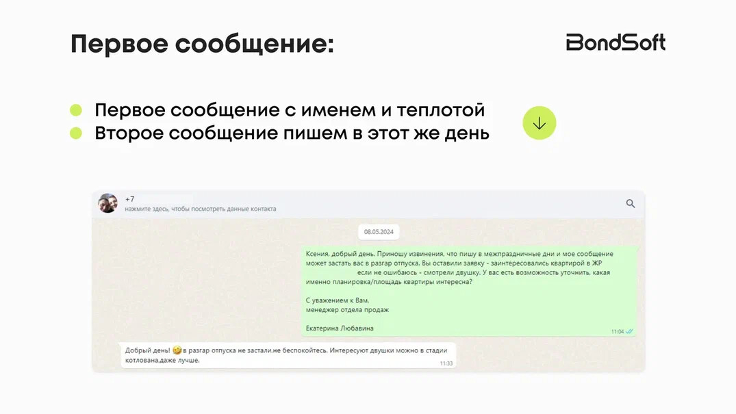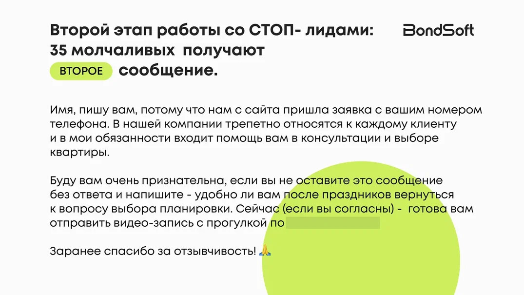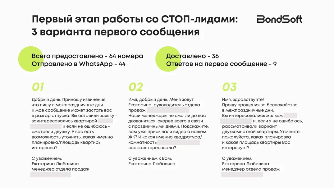 Если на первое сообщение не последовал ответ, мы отправляли дополнительные сообщения через установленные интервалы, каждый раз немного меняя угол подхода, чтобы привлечь внимание клиента.