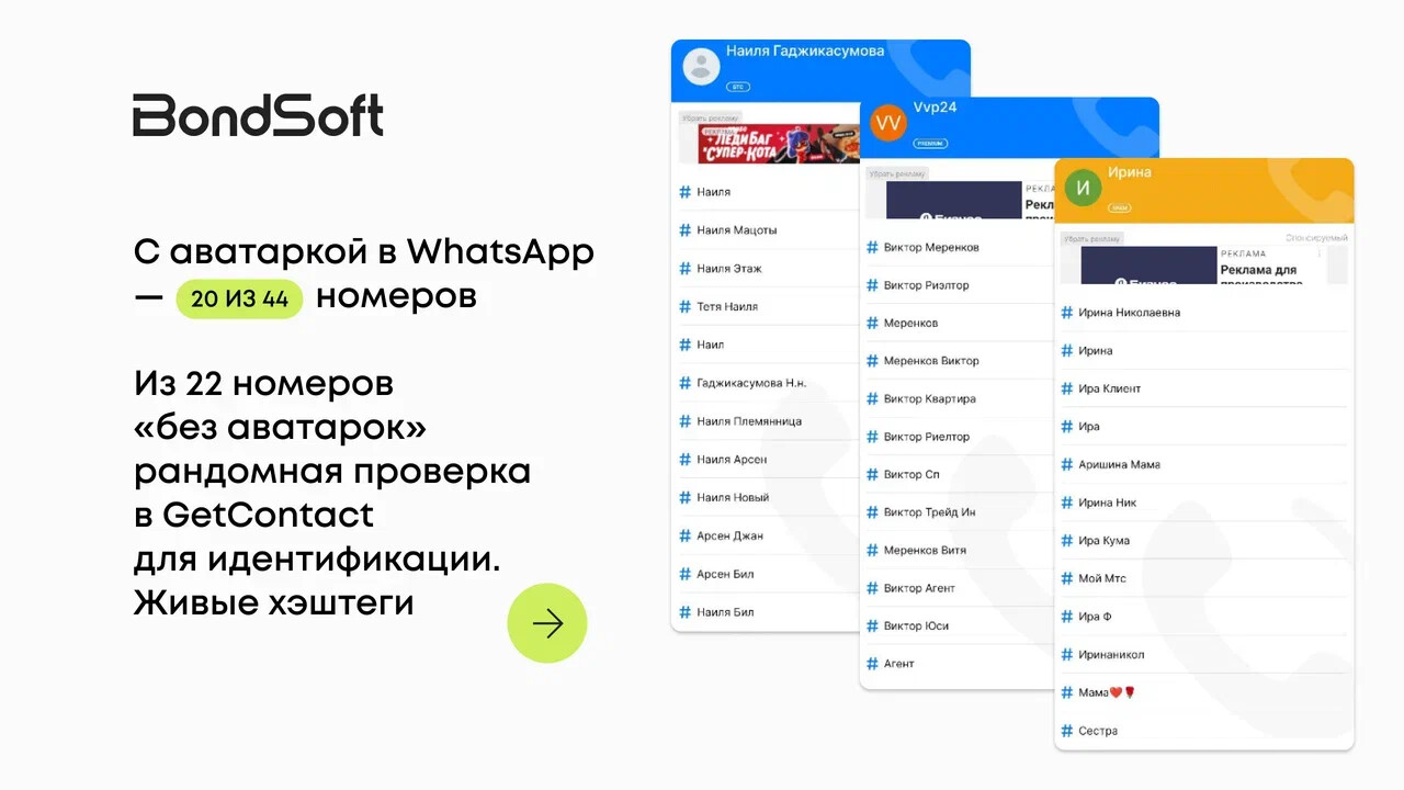 Из 64 номеров 44 были в WhatsApp, из них 20 с аватарками реальных людей. Еще 22 номера без аватарок мы проверили через GetContact. Смотрели "живые" хештеги.