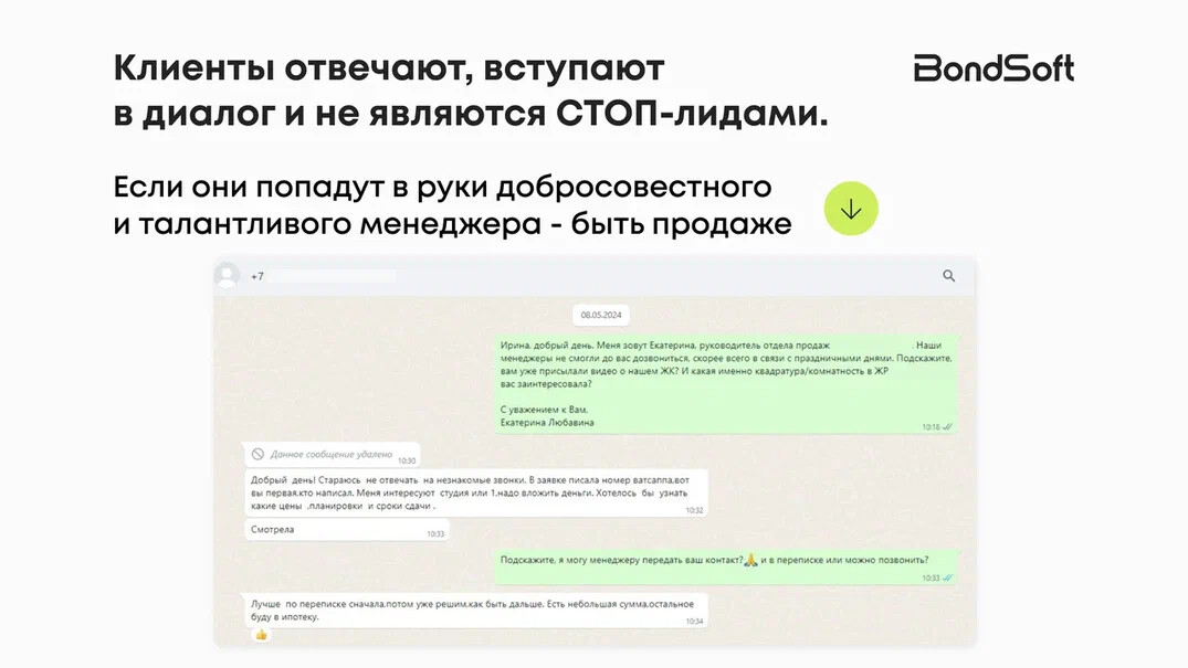 "Ну и где же горячие клиенты? Видите, люди не покупают в переписке!" — уже слышим по ту сторону экрана. Но мы и не говорим о том, что в первой переписке возможна продажа. Мы говорим о том, что клиенты отвечают, вступают в диалог, и оказывается, они никакие не СТОП-лиды. Если они попадут в руки добросовестного и талантливого менеджера — быть продаже.