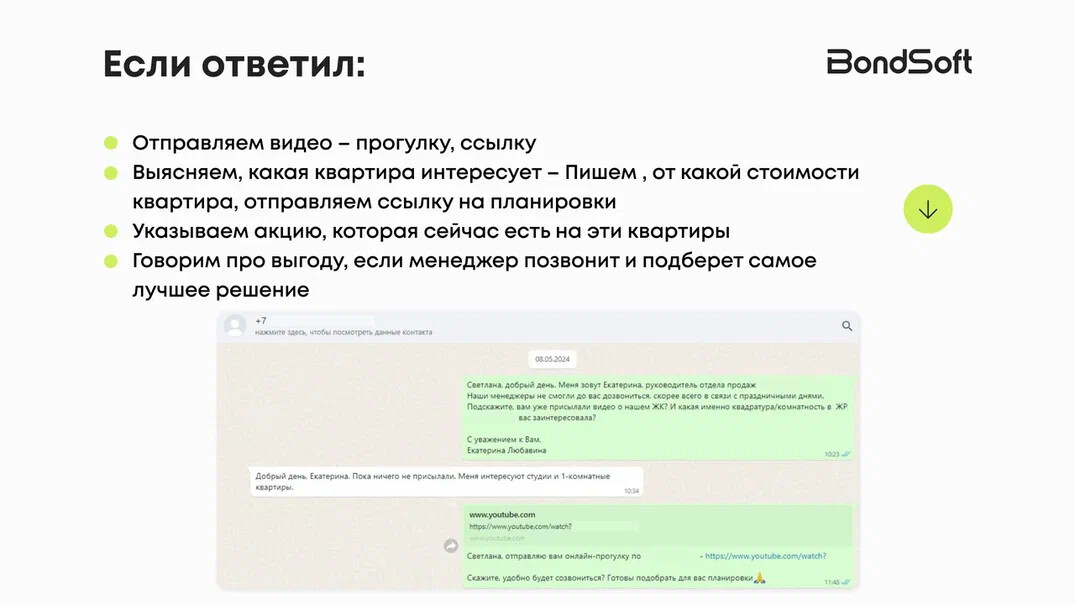 Как только клиент отвечал, мы переходили к активному диалогу. В зависимости от интереса, мы отправляли видеопрогулку по жилому комплексу, информацию о стоимости и планировках или актуальные акции.