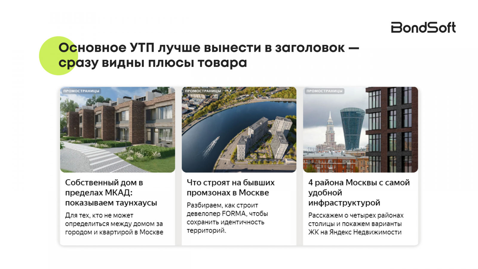 Но читатель может не знать, что в районе уже построили несколько школ, запустили новые автобусные маршруты и строят трамвайную ветку. Для привлечения подойдут заголовки вроде: «Топ-5 мифов о районе таком-то..», «Переехали в новый ЖК Веселый и добираемся до центра за 15 минут» или «4 причины рассмотреть ЖК Веселый. Своя школа и спортзал, а трамвай идет до центра 15 минут».